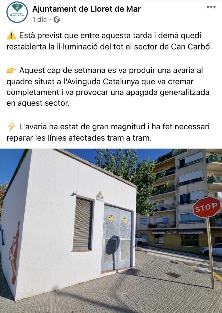 Con el precedente durante toda la semana pasada en el barrio de Can Carbó (Lloret de Mar) quedándose los vecinos sin luz pública durante 6 días, según fuentes municipales por un problema de grandes magnitudes.
