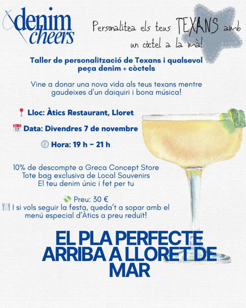 - Aquest divendres 7 de novembre, de 19 h a 21 h, el Restaurant Àtics de Lloret de Mar acollirà una proposta diferent i plena d’estil: “Denim Cheers”, una tarda dedicada a la creativitat, la moda i la cultura local.