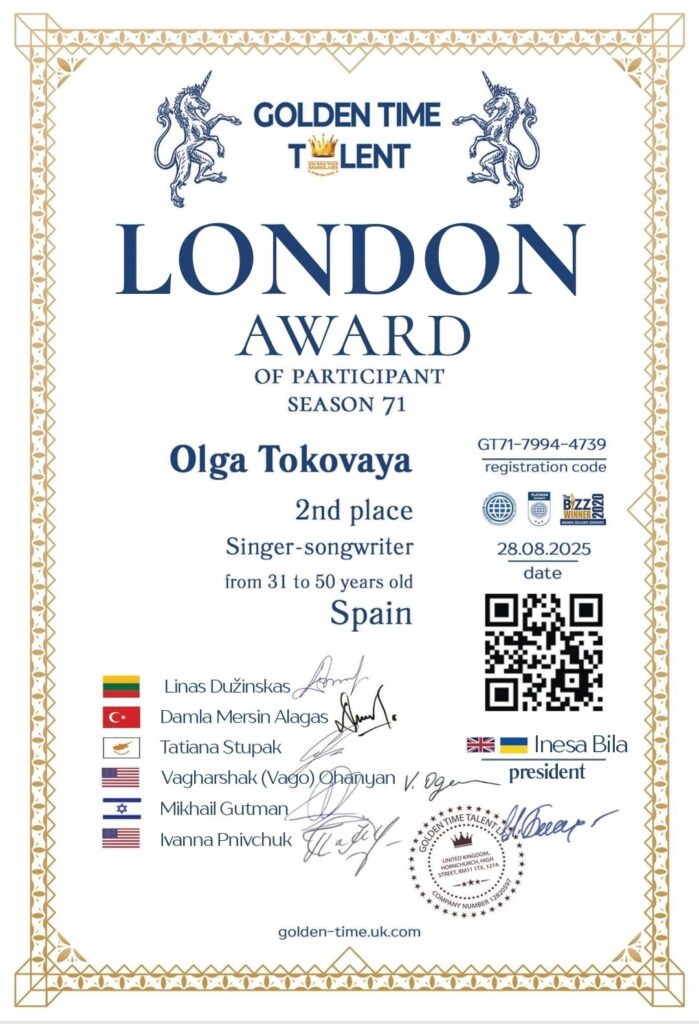 Olga, aunque no es cantante profesional, ha ganado el segundo premio del concurso inglés Golden Time Talent. Un concurso internacional en línea que contaba con los mejores cantautores de 70 países. Ganó ese premio con una canción en ruso que, su traducción sería El momento de ser tú misma. Pese a tener reconocimientos internacionales, ella se siente muy cobijada por su comunidad local, tanto rusa como española, ya que gracias a su apoyo, también la han animado a seguir.