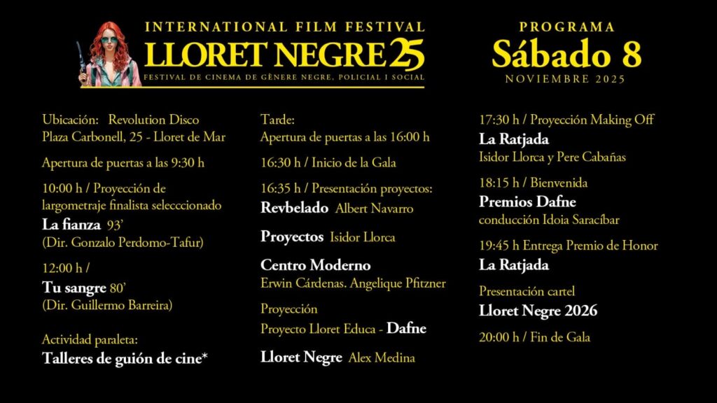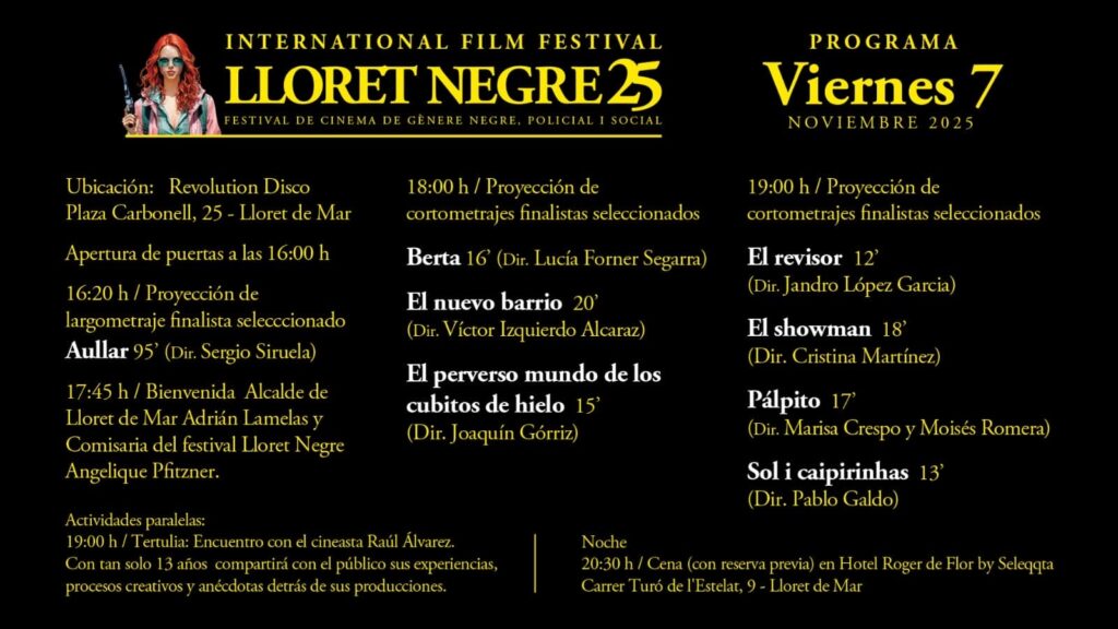 Lloret Negre 25, International Film Festival dedicat al gènere negre, policial i social, torna aquest cap de setmana a Lloret de Mar amb una programació extensa i activitats per a tots els públics. Del divendres 7 al dissabte 8 de novembre, la sala Revolution Disco (Plaça Carbonell, 25) serà l’epicentre de projeccions, tertúlies, tallers, entrega de premis i la gala de clausura.