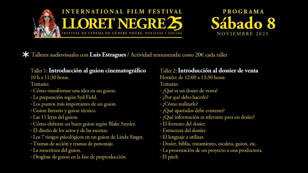 Paral·lelament hi haurà tallers audiovisuals amb Luis Estragues (activitat de pagament 20€ per taller), que se celebraran també a Revolution Disco. Taller 1 (10:00–11:30) és una introducció al guió cinematogràfic amb temes com la transformació d’una idea en guió, la preparació segons Syd Field, guió literari i tècnic, les 11 lleis del guió i la reescriptura. Taller 2 (12:00–13:30) tracta sobre el dossier de venda: què és, per què fer-lo, estructura, format i com presentar un projecte a una productora (pitch, bibliografia, tractament, escaleta).