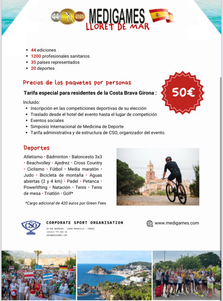 Lloret de Mar se prepara para vivir una semana histórica con la llegada de los Medigames 2025, también conocidos como los Juegos Mundiales de Medicina y Salud. Del 7 al 14 de junio, más de 1.200 profesionales de la salud procedentes de 45 países aterrizarán en la ciudad para competir en más de 20 disciplinas deportivas y asistir a un simposio médico de primer nivel.